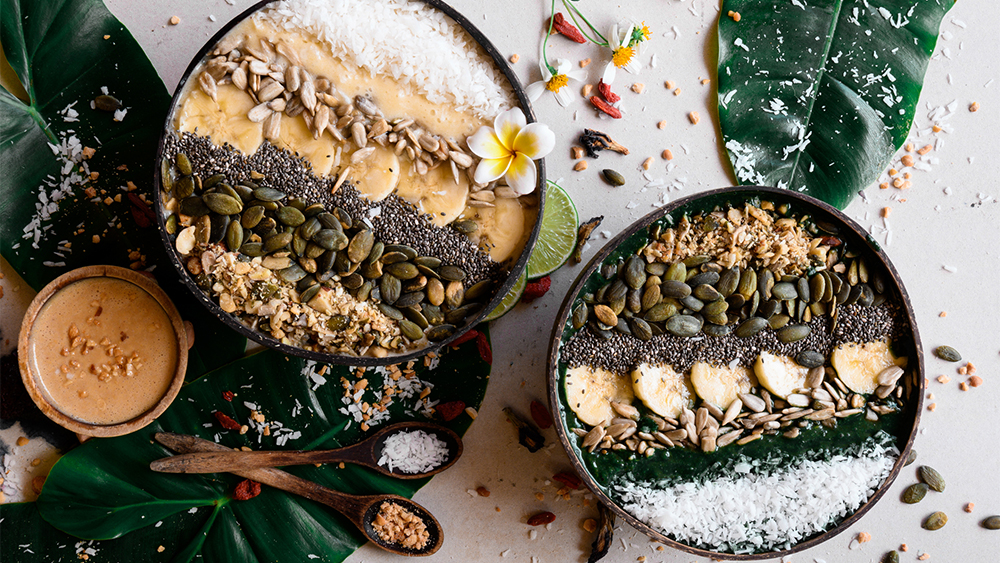 Finom, turmixos tál. Főleg az év meleg hónapjaiban. Kevesebb folyadék felhasználásával készíts sűrűbb turmixot, és öntsd egy tálba. A tetejét apróra vágott dióval, magvakkal, friss gyümölccsel és granolával tegyük a színes és ízletes reggeliért.