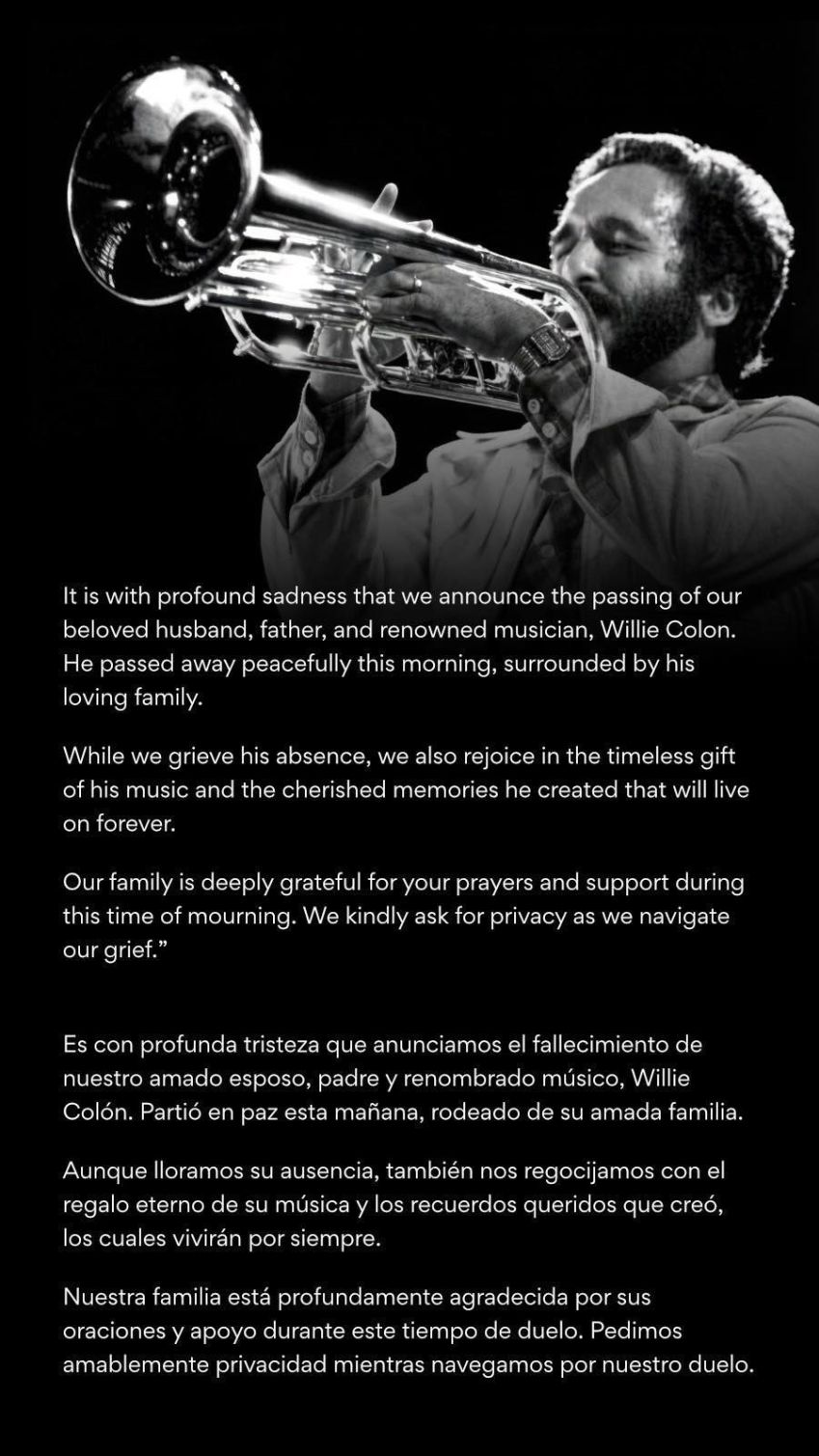 „Mély fájdalommal tudatjuk, hogy elhunyt szeretett férjünk, édesapánk és neves zenész, Willie Colón. Ma reggel békésen elhunyt, szerető családja körülvéve” – ​​áll a Facebookon közzétett közleményben.