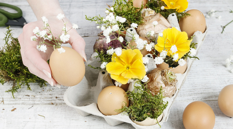 Helyezzük vissza a tojáshéjakat a tojásdobozba (ahogyan a fő fotón is látható), hogy a helyükön maradjanak, és töltsük meg mindenféle díszítéssel, élő zölddel. Mint a moha és a kis virágok. Hagyhatja semleges színű vagy festheti őket.
