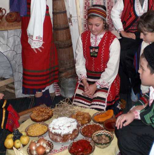 További hagyományos bolgár ételek a szenteste asztalára: sarmi, babsaláta, sült bab vagy pörkölt, töltött paprika, diófalat, savanyúság, búza, oshav, sütőtök.