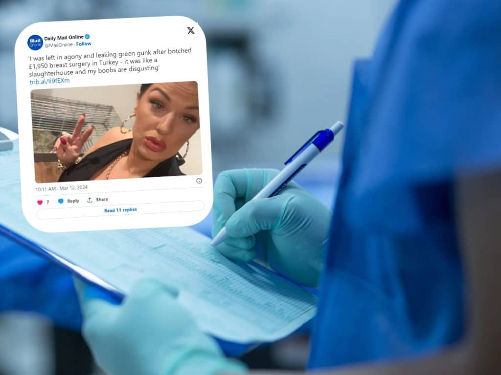 „Kínok között szenvedtem és zöld trutymót szivárogtattam az elfuserált 1,950 font értékű törökországi mellműtét után – olyan volt, mint egy vágóhíd, és a melleim undorítóak pic.twitter.com/OuSennmRSV