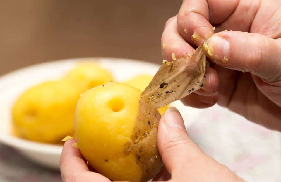 A főtt burgonyáról viszonylag könnyen eltávolítható a héja, ha főzés előtt a burgonyát a közepén végig vágjuk, majd hagyjuk főni. Főzés után a bőr gyorsan leválik mindkét oldalról, hasonlóan a kupak levételéhez. Ne vágjon mélyen, és próbálja meg úgy, hogy a vágás az elején és végén összeérjen.