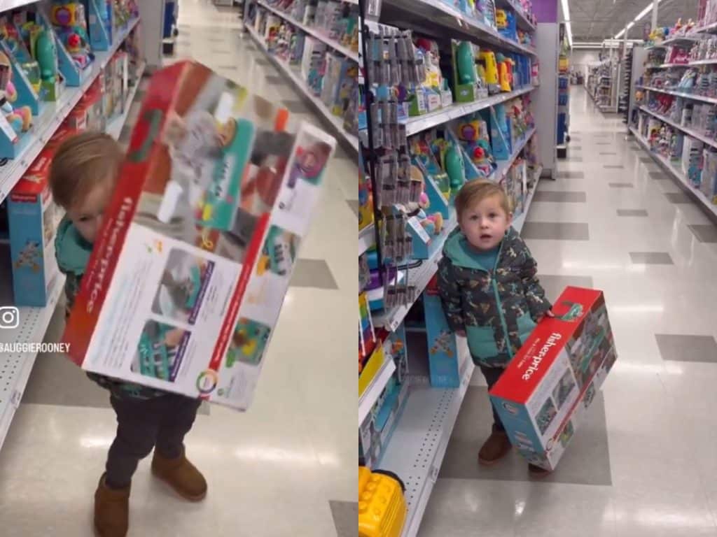 A videóban egy gyermek látható, aki két kézzel egy dobozt tart, és egy bolt játékfolyosóján áll.