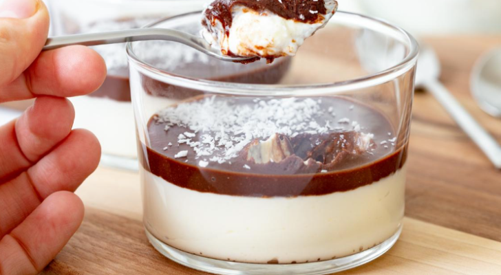 4. Ellenőrizze, hogy a ganache már nem túl meleg-e, és osszuk el a joghurtos poharakra. Díszítésképpen szórjunk rá kókuszreszeléket. A desszerteket hűtőben tároljuk, hogy a ganache még egy kicsit megszilárduljon, vagy azonnal tálaljuk, amíg a ganache még puha.