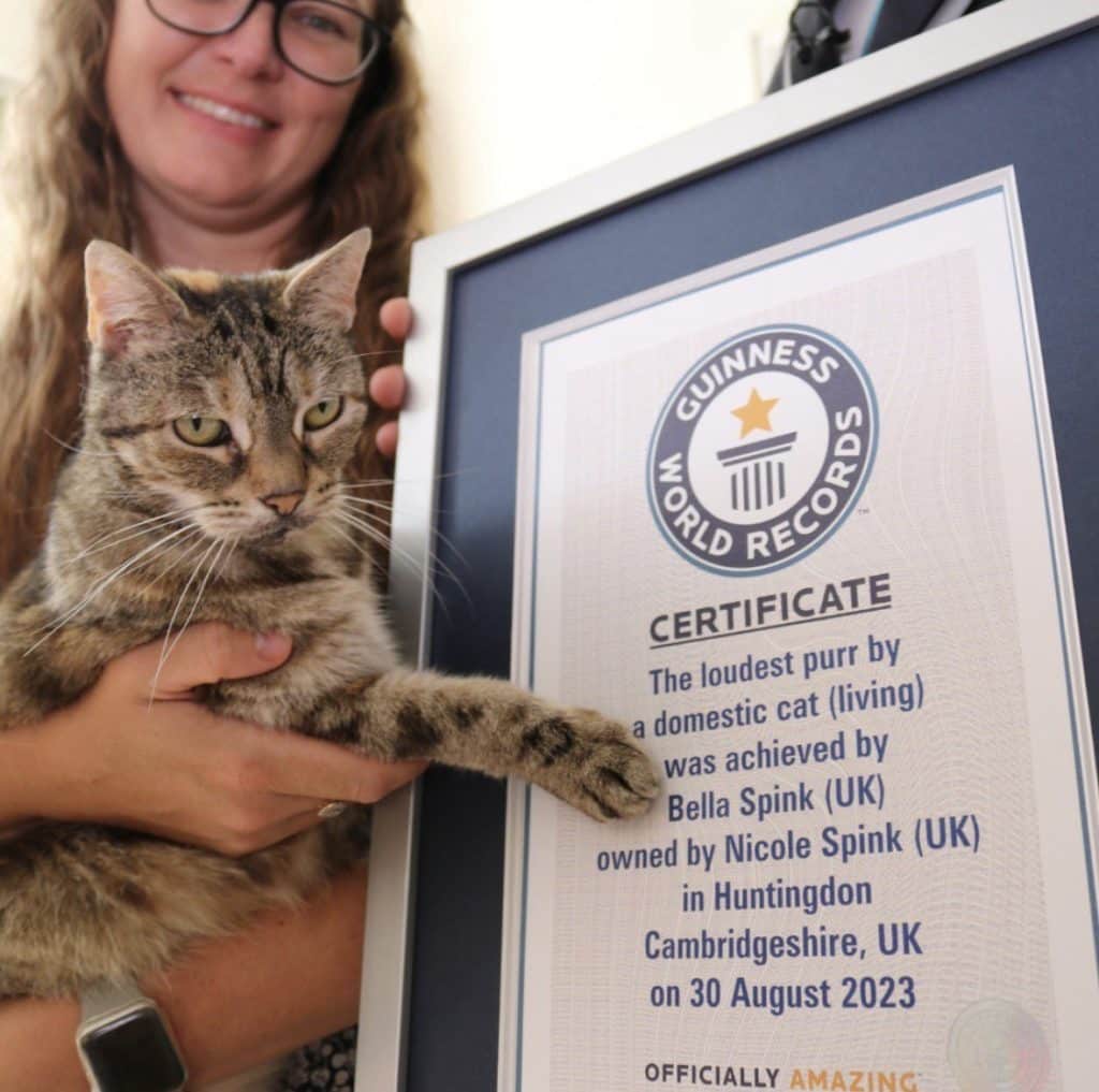 Amikor a vendégek meglátogatják Nicole Spink-et, gyakran megkérdezik tőle: „Mi ez a hangos zaj?”, majd rájönnek: „Ah, ez egy macska. Ő csak egy boldog Bella.” A család mindig meg volt róla győződve a macska morog a leghangosabban a világon. Egy napon lesz a nő és a lánya úgy döntött, hogy ellenőrizni fogják. Letöltöttek egy alkalmazást, amely méri a hangintenzitást, és megállapították, hogy jóslataik beigazolódtak.