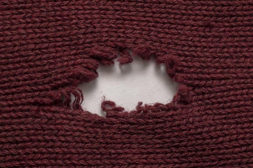 Végül is van egy kis különbség. A szövetekkel ellentétben a pulóverek kötöttek. A pulóveren lévő lyuk kijavítása nem csak arról szól, hogy ha egy vagy két lyuk elcsúszik, a lyuk azonnal nagyobb lesz. A lyuktól lefelé húzza ki az összes öltést, és csak a kinyújtott fonal marad a helyén, ahol eredetileg volt.