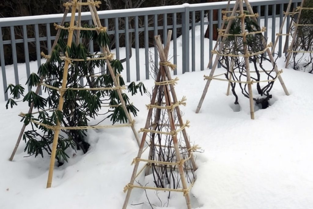 Helyezze a megmaradt lucfenyő ágakat a törzs köré kúp vagy kunyhó alakjában. Rögzítse a szerkezetet puha kötéssel vagy kötéllel két ponton – felül és középen. A rögzítésnek megbízhatónak, de óvatosnak kell lennie, hogy ne sértse meg a fiatal fa finom kérgét.