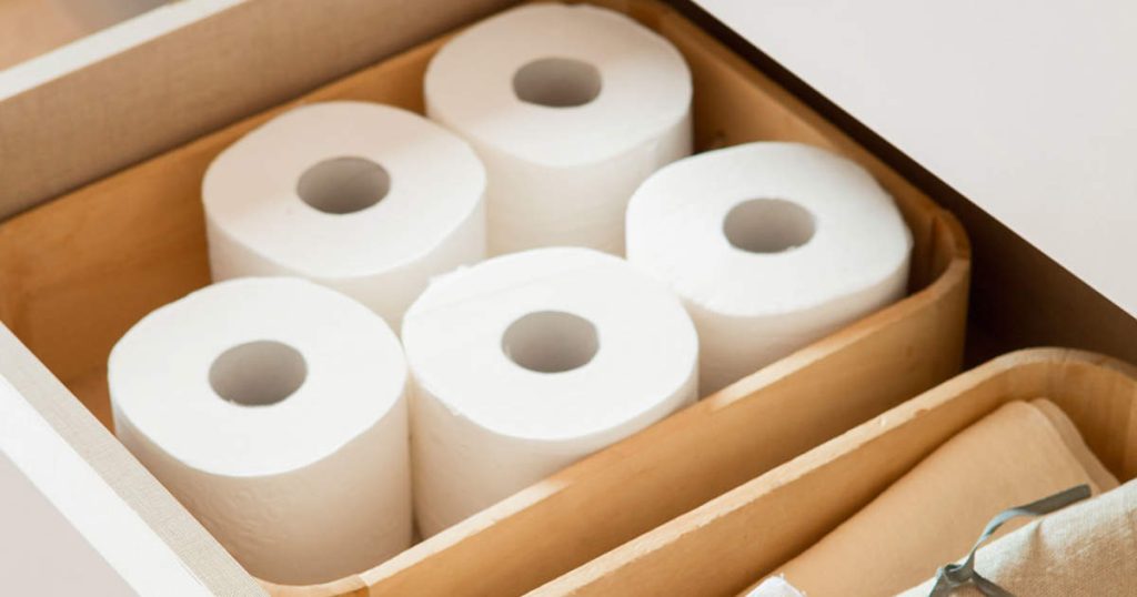 A mosogató alatti szekrényfiók részlete WC-papírral és törölközőkkel összehajtva és függőlegesen tárolva.