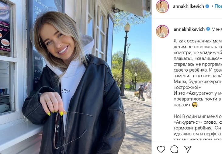 Kiadványában Khilkevich megjegyezte, hogy az „óvatosan” szó lelassítja a gyermeket. Idealista és perfekcionista lesz. A színésznő szerint ez rossz jel, mivel az ilyen tulajdonságok nem mindig segítenek a babának.