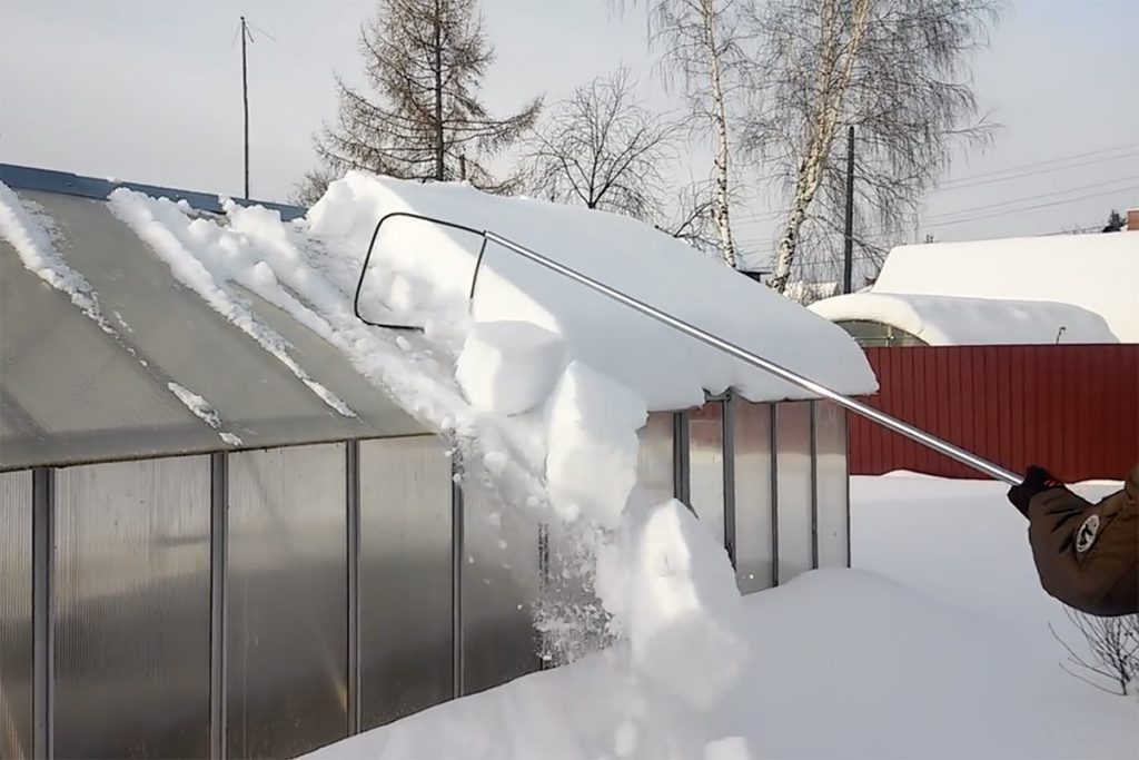 Kényelmes egy hosszú kaparó is, amelynek végén téglalap alakú hurok található. Óvatosan eltávolítja a hó „kockáit” a polikarbonátból. Alulról felfelé haladva toljuk végig a tetőn. A keret levágja a havat és könnyen legurul. De vigyázz, nehogy elaludj magad.