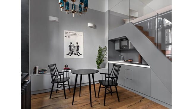 A hely adottságai – a mennyezet, a nagy boltíves ablakok, a vastag falak – az ipari romantikaként meghatározott stílusok keverékévé varázsolták. A fa, az üveg és a fém harmonikusan megfér egymás mellett, bizonyítva, hogy még egy miniatűr területen sincsenek lehetetlen megoldások. Minden bútor rendelésre készül, a színválaszték pedig a tulajdonos profiljához tökéletesen illeszkedik.