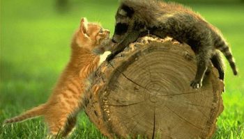 Hogyan próbált megbarátkozni egy mosómedve egy macskával (VIDEO)