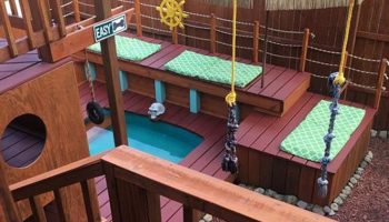 Az ember a hátsó udvarát egy nagy játszótérré alakítja kutyamedencével