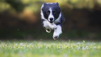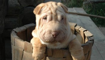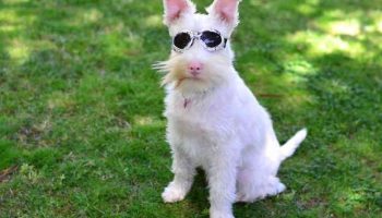 Az albínó kölyökkutya sötét szemüveget írt fel a szeme védelmére