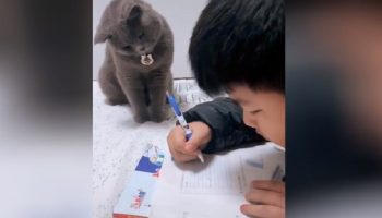 Nézze meg, hogyan irányítja a macska a fiút a házi feladatban