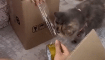 A macska levágja a ragasztószalagot, hogy segítsen a nőnek becsomagolni a dobozt. Néz