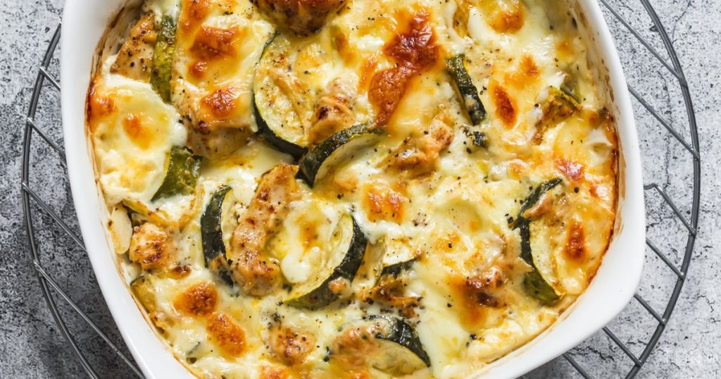 Egy tepsit kikenünk vajjal, és először rétegesen ráhelyezzük a cukkinit, majd a csirkét. A felső réteget megszórjuk zsemlemorzsával és leöntjük tejföllel.