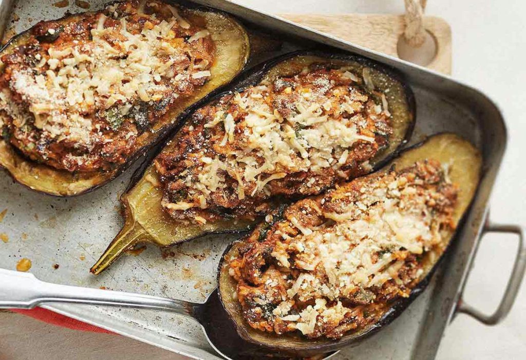 - Töltsük meg a padlizsán felét a keverékkel, szórjuk meg zsemlemorzsával és kemény sajttal. A töltött padlizsánt a sütőben 10-15 percig sütjük, amíg a teteje aranybarna nem lesz.