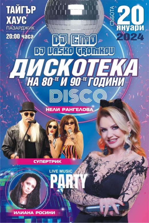 Hamarosan, január 20-án (szombaton) a pazardzhik-i „Tiger House”-ban a diszkóslágerek rajongói élvezhetik a nagyszerű Nelly Rangelovát, aki a „Supertrick” csoporttal együtt tánc és tánc terén végtelenné varázsolja az estét. jó hangulat. Segítségükre lesz a bájos Illiana Rossini, akinek hangja és színpadi jelenléte senkit sem hagyhat közömbösen.