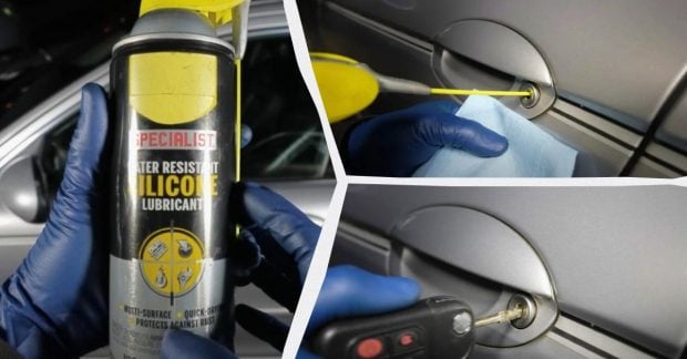 Csak annyit kell tennie, hogy egy kis szilikon kenőanyagot fújjon a kulcslyukba. Ezután helyezze be a kulcsot, és mozgassa úgy, hogy a kenőanyag jól eloszlassa a lyukban. Törölje le a felesleget papírtörlővel.