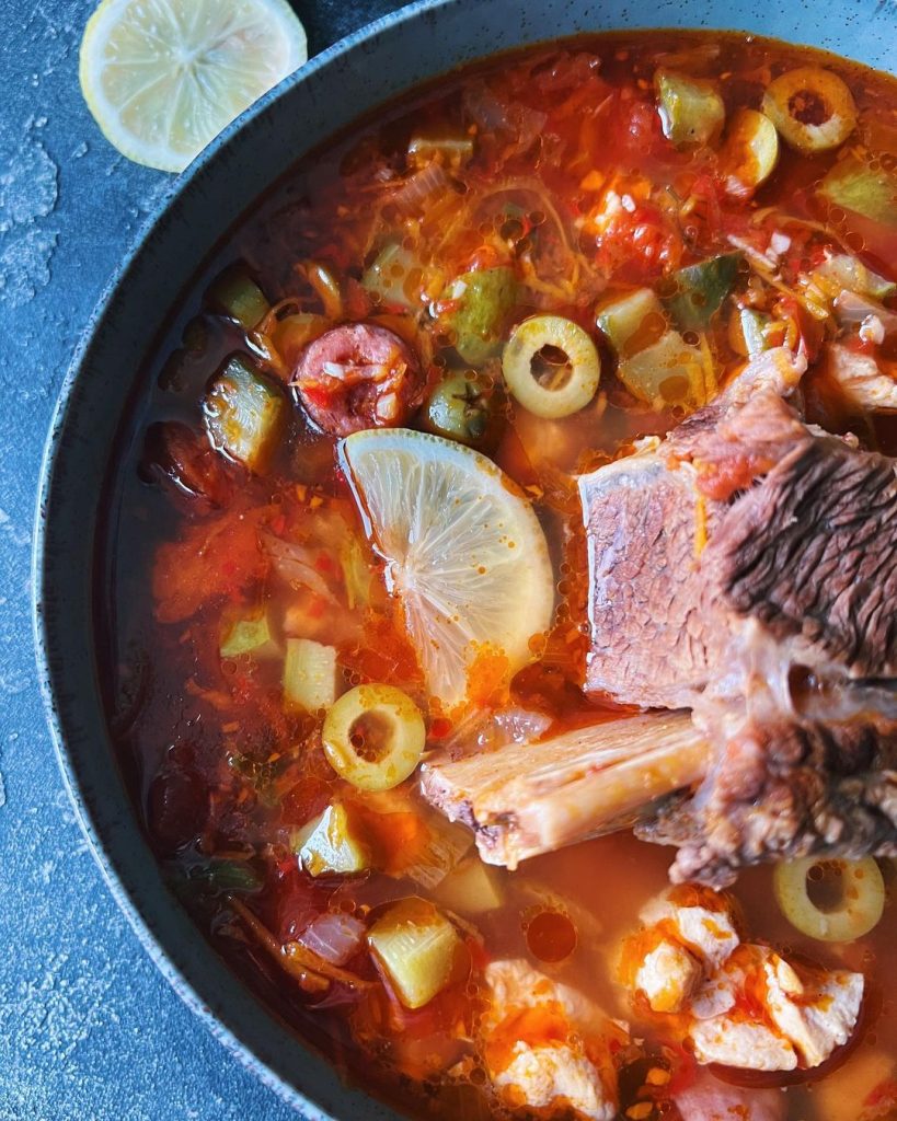 Séf a solyanka receptjével Valya Saenko az Instagramodon. Hangsúlyozta, hogy szereti ezt a levest, mert bármilyen húst bele lehet tenni. Az ötletes háziasszonyok vagy gazdik pedig az ünnep után elkészíthetik a maradék füstölt húsokból.