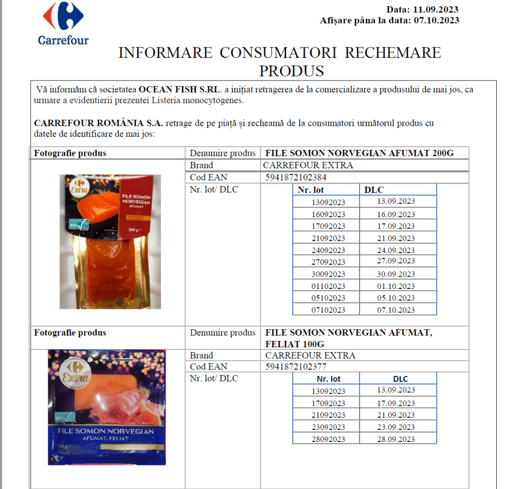 Ezzel összefüggésben a növény-egészségügyi hatóságok új élelmiszer-riasztást hirdettek Romániában Listeria miatt legalább két halfajtában, aminek eredményeként a nagy szupermarketek kivonták a polcról a szennyezett halat (lásd a teljes sajtóközleményt itt).