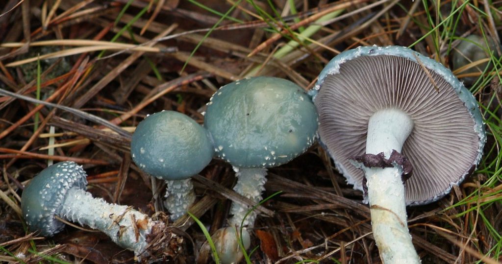 Élénk színű – türkiz/zöldes kék, néha akvamarin, ezüstös fényes. A gomba húsa meglehetősen kompakt és a kopoltyúk sűrűek, a szárhoz rögzítve, kezdetben könnyű és kissé sötétebb az idősebb egyéneknél).