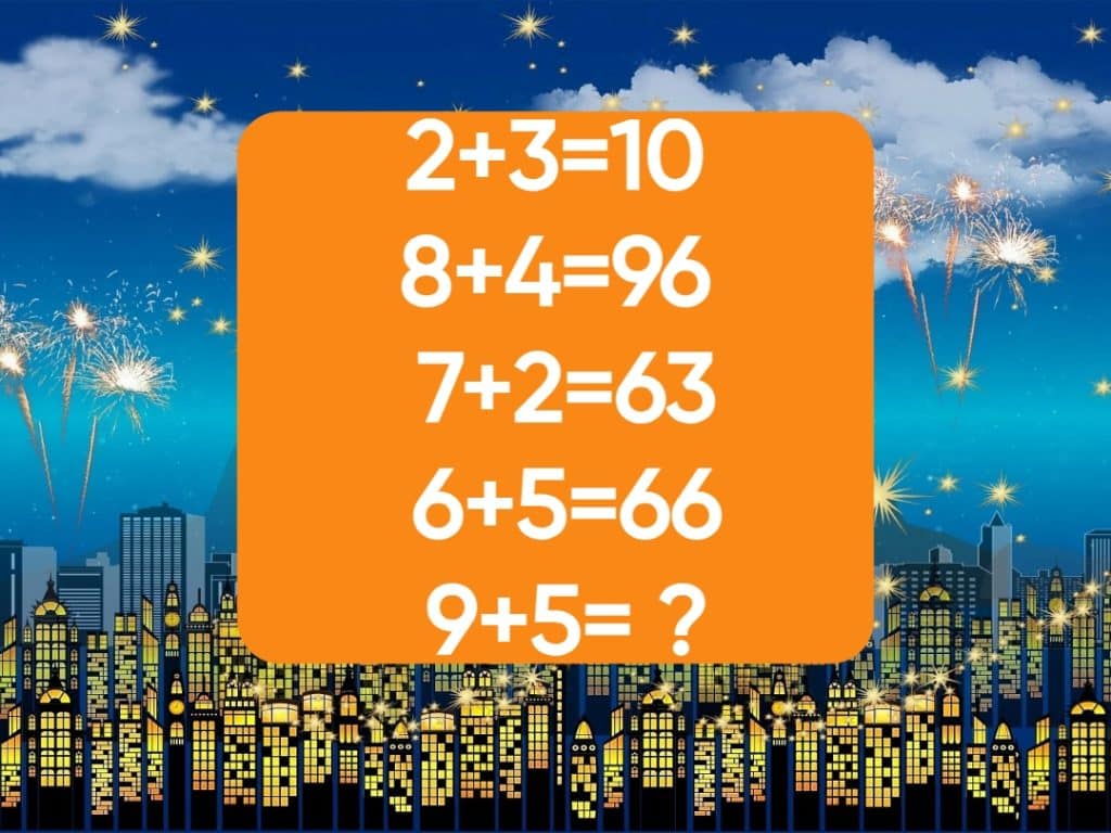 „2+3=10, 8+4=96, 7+2=63, 6+5=66, 9+5=?”