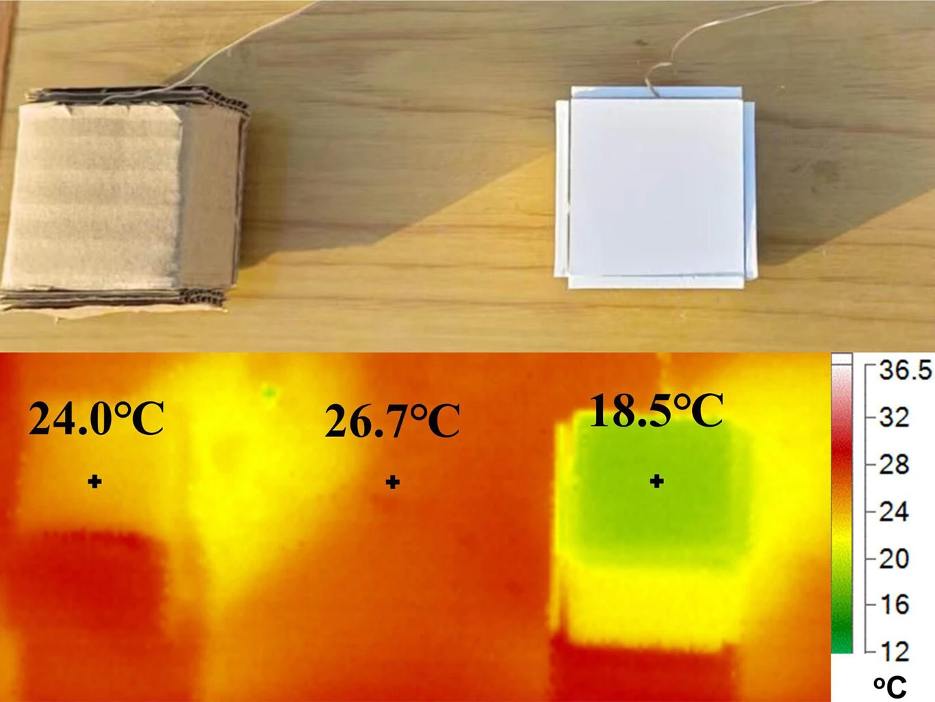 Az anyagból készült dobozzal végzett kezdeti tesztek során, míg a külső levegő hőmérséklete 26,7 °C volt, a doboz belseje 18,5 °C-ot ért el, ami figyelemre méltó csökkenés az azonos méretű kartondobozhoz képest, de a belső hőmérsékletet csak 24 °C-ra sikerült csökkenteni.