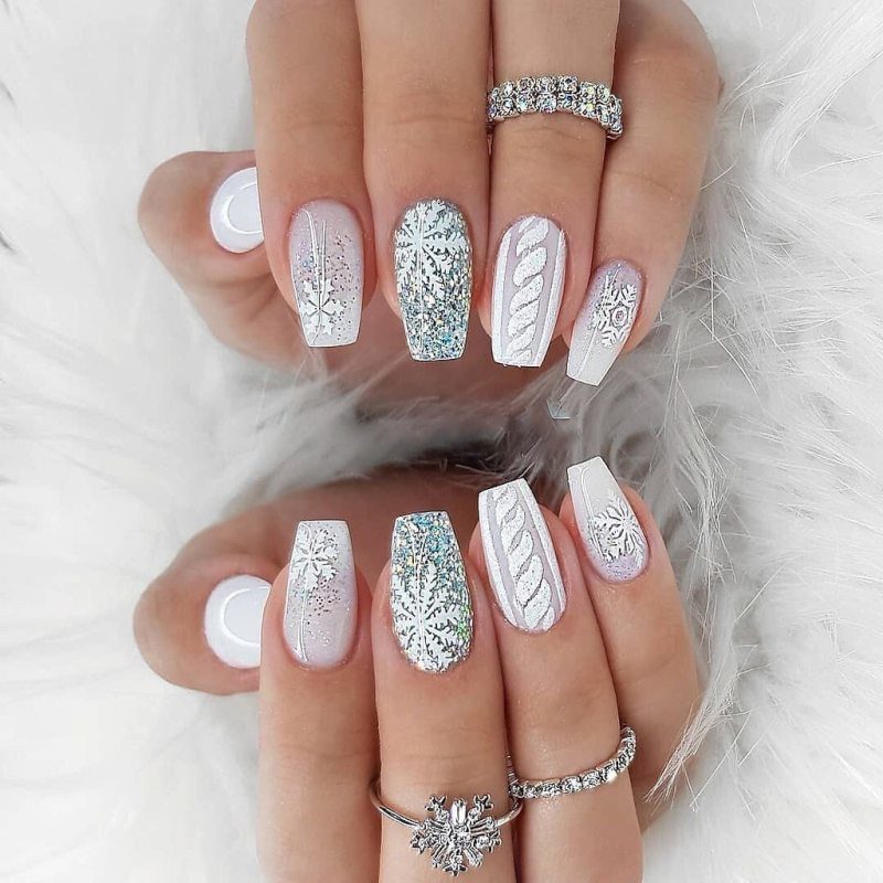 A fehér szín univerzális. Bármilyen megjelenéshez és színösszeállításhoz alkalmas. A fehér hátteret csillámokkal élénkítheted. Elég egy vagy két körmöt díszíteni, és a manikűr élénkebb és elegánsabb lesz.