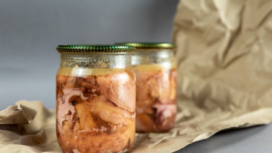 A húst közepes méretű darabokra vágjuk, és szorosan elrendezzük az üvegben, sózzuk, babérlevelet és fekete borsot teszünk közéjük. Lezárjuk és három órán át forraljuk. Közvetlen fogyasztásra és manjihoz adható.