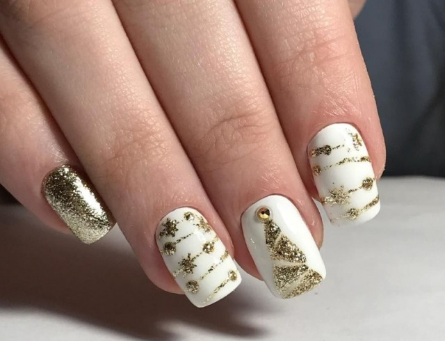 Ez egy fehér vagy tejszerű manikűr csillámokkal, francia technikával készült. Télen különösen lenyűgözőnek és megfelelőnek tűnik télen! És ami a legfontosabb, egyáltalán nem nehéz elkészíteni, és még a kezdő kézművesek is megbirkóznak vele!