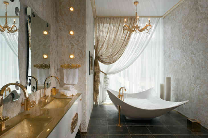 A fúziós stílusú fürdőszoba alakja nem rendelkezik egyértelmű vízszintesekkel és függőlegesekkel. Például a falakon és a mennyezeten ívelt felületek készíthetők gipszkarton szerkezetekkel.