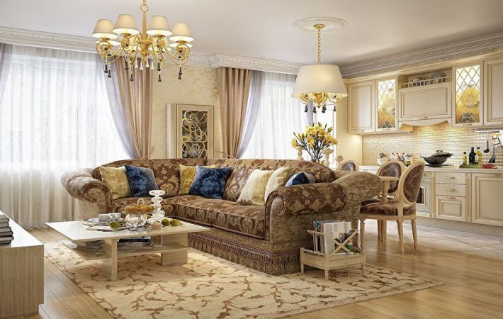 A klasszikus stílusú konyha-nappali színsémájának visszafogottnak kell lennie. Itt nem talál olyan élénk árnyalatokat, amelyek átadják a helyét a nyugodt, tömör színeknek.