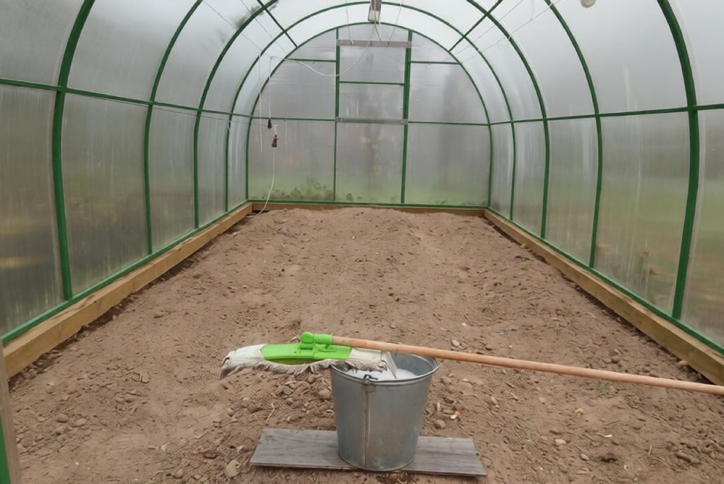 Első lépésként az üvegházat kiürítik a tavalyi növényi törmelékből. Minden gyökér, levél, szár feltétel nélküli eltávolításnak és ártalmatlanításnak van kitéve. A szerves maradványokkal együtt el kell távolítania a köteleket, léceket, csapokat és minden egyéb harisnyakötő anyagot, amelyet az előző szezonban használtak. Ezek a tárgyak menedékül szolgálhatnak az áttelelő kártevők és gombaspórák számára.