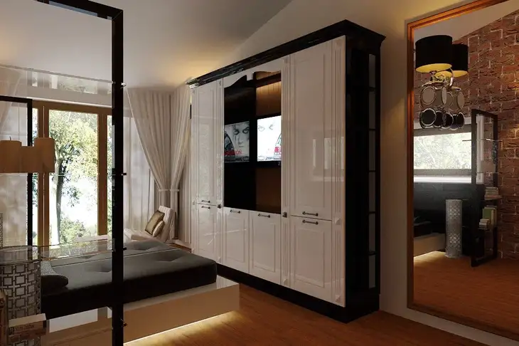 Ehelyett a tervezők ragaszkodnak egy olyan beépített gardrób vásárlásához, amely az egész falat elfoglalja. Ennek az apró trükknek köszönhetően a bútor nem fog terjedelmesnek tűnni, de ugyanolyan tágas marad.