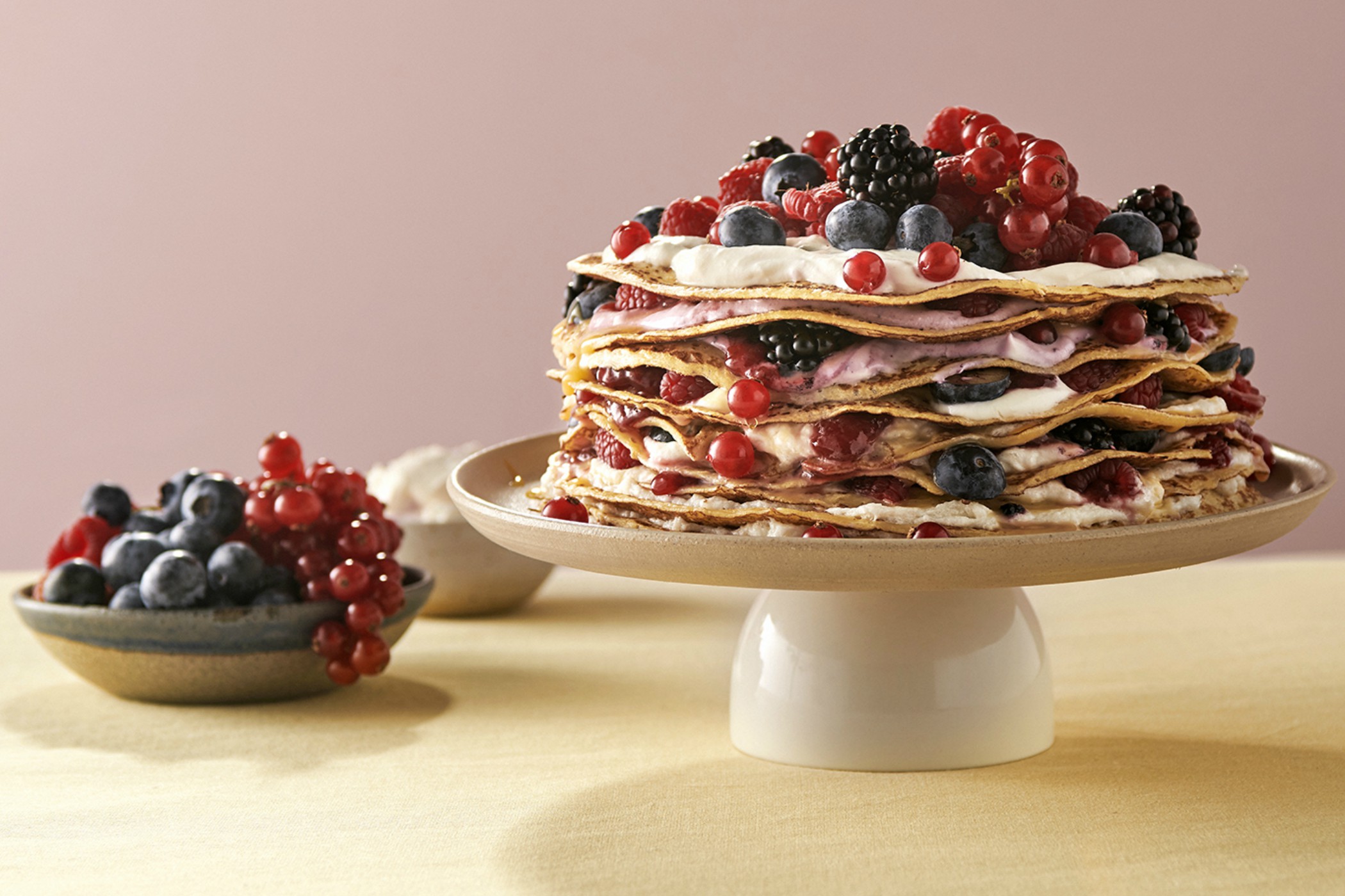 - A felső palacsintát bőségesen megkenjük joghurttal, és bogyós gyümölcsökkel, szederrel és málnával díszítjük.