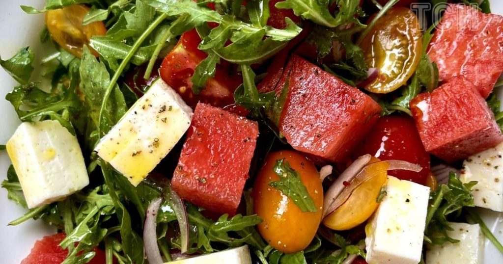 Az étel elkészítése nagyon egyszerű – az összes hozzávalót apróra vágjuk, és ízlés szerint fűszerezzük. A legjobb, ha a görögdinnyét és a sajtot apró kockákra, a hagymát pedig vékony szeletekre vágjuk.