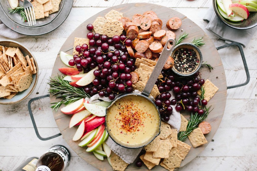 „Friss gyümölcs (szőlő, gránátalma, bogyós gyümölcsök, alma vagy körte); dió; pirítós vagy ropogós keksz; némi chutney vagy lekvár, még a birsalma zselé és savanyúság is jó.” Ribizli, bogyók vagy piros gyümölcsök is választhatók amelyek segítenek nekünk egy professzionális és karácsonyi sajttábla elkészítésében.