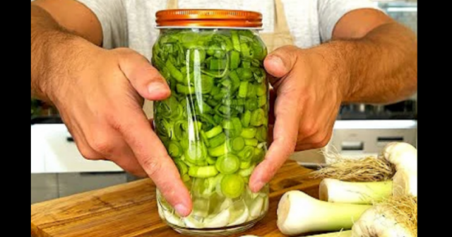 A póréhagymát kis karikákra vágjuk, majd a két hozzávalót egy nagy, egyliteres üvegbe tesszük.