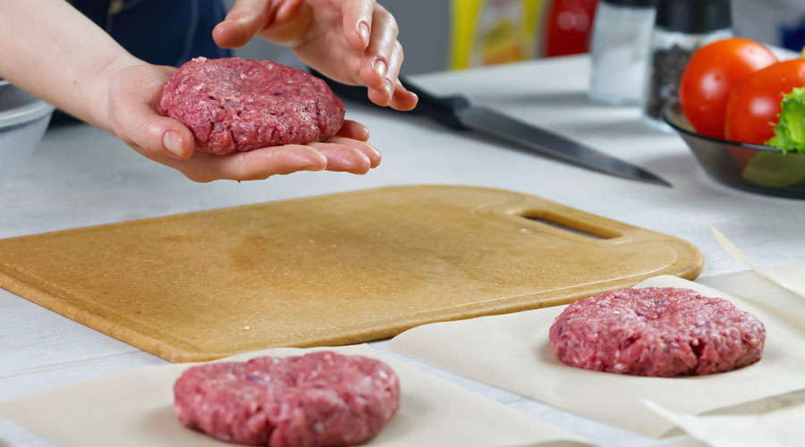 A húst a lehető legrövidebb ideig gyúrjuk, amíg össze nem áll, és csak röviddel az elkészítés előtt adjunk hozzá egy kis sót és borsot. Osszuk egyenlő részekre a húst, hogy egyenletesen süljenek át. Egy átlagos hamburger súlya körülbelül 100-150 gramm. Ezt a legegyszerűbb megtenni, ha lemérjük a golyókat. Mielőtt ellapítaná a golyókat, nedvesítse meg a kezét, és ne legyen túl lapos vagy túl vastag a hamburger. Körülbelül 1-1,5 centiméter vastagság az optimális. Ha laposabbak, akkor túl gyorsan sülnek meg, ha pedig vastagabbak, akkor gyorsabban megégnek, míg a belseje még nem sült meg.