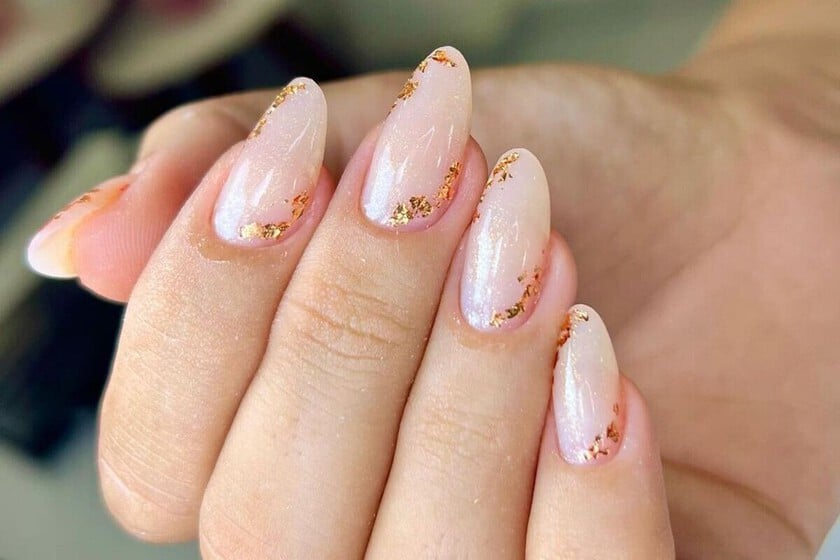 Egy egyszerű és elegáns halványrózsaszín manikűr teljesen megváltozhat néhányval aranylevél érintései. Csak tetszés szerint véletlenszerűen kell elhelyezni őket az összes körömre vagy csak néhányra.