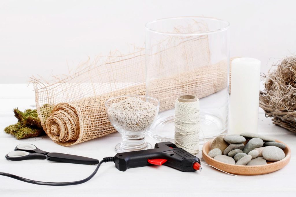 Az eljárás hasonló az előző esethez, csak itt óvatosan körbe kell rétegezni az egyes természetes anyagokat. Az olvasztópisztolyok díszítésre is használhatók.