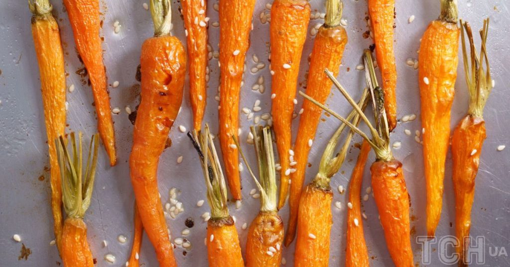 A keverékből 2 evőkanálnyit félreteszünk, hogy később díszítsük, a többit pedig a sárgarépával együtt egy peremes tepsire dobjuk. A sárgarépát 18-20 perc alatt enyhén aranybarnára sütjük, a széle pedig enyhén elszenesedik.