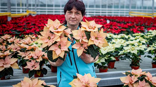 Ilona Košťálková kertész és a karácsonyi csillagként ismert csodálatos Euphorbia pulcherrima (Euphorbia pulcherrima) a Florcenter Ostrava kertészeti központ üvegházaiban.