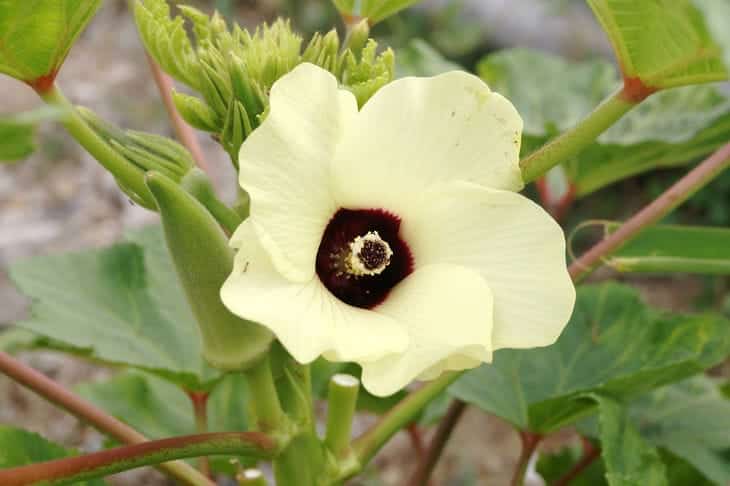 Krémszínű, vörös-ibolya vagy ibolya közepével, az okra virágai a mályvához hasonlítanak, a levelei pedig a szőlőhöz.