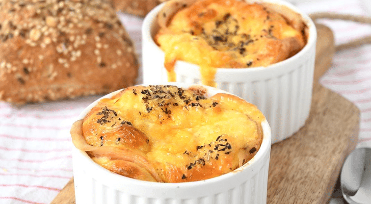 1. A ramekineket kibéleljük a pancetta szeletekkel. A cheddart darabokra vágjuk, és a felét a ramekinekre osztjuk.