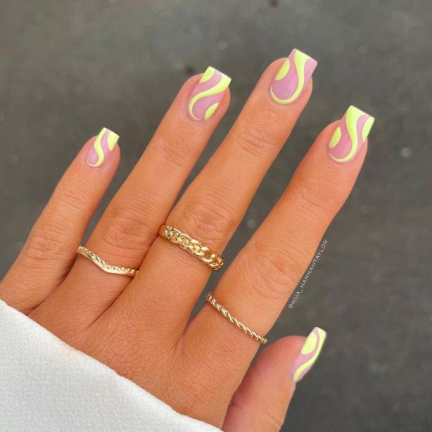 Innovatív design, amely egyesíti a francia manikűr finomságát a sárga örvények művészi érintésével.