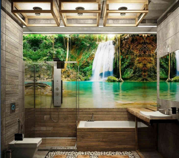 Például a fürdőszoba padlója készülhet természetes kőből vagy fa deszkából. Gyakori technika a mozaik panelek elrendezése a falakon.
