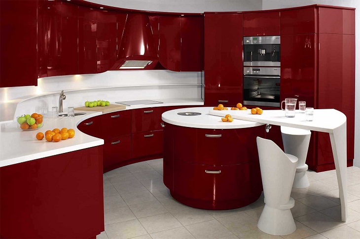 Az ilyen színekkel díszített konyhák mindig nagyon lenyűgözőek, különösen fényes kivitelben. A vörös tónusú konyha egyedülálló elegánsságával és luxusával tűnik ki.